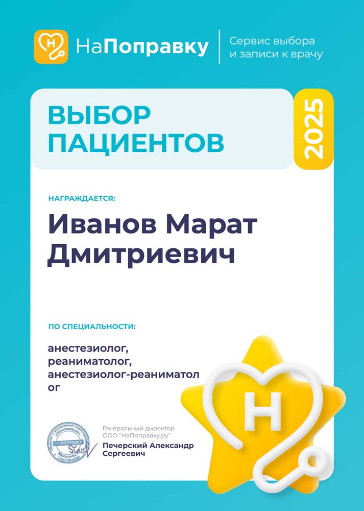 Искренне благодарна врачу-анестезиологу Иванову Марату Дмитриевичу! Он замечательный специалист и доказал это на деле! Врач подобрал для меня самые подходящие лекарства, рассчитал грамотно в ка...
