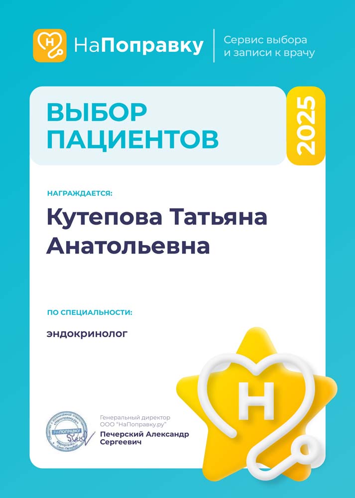 Была на приёме у доктора эндокринолога Кутеповой Татьяны Анатольевны.