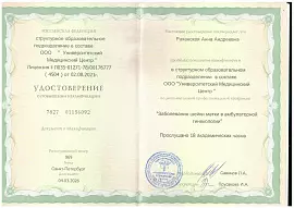 2021 г. – Повышение квалификации на базе ЧОУ ДПО «Межрегионального института дополнительного профессионального образования» (г.Тольятти) по программе «Детская гинекология».