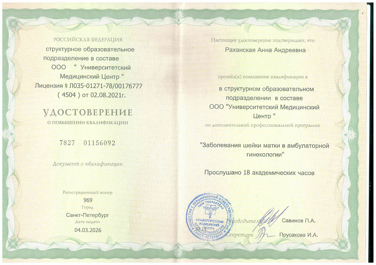 2026 г. - ООО Университетский Медицинский Центр, «Заболевания шейки матки в амбулаторной гинекологии»